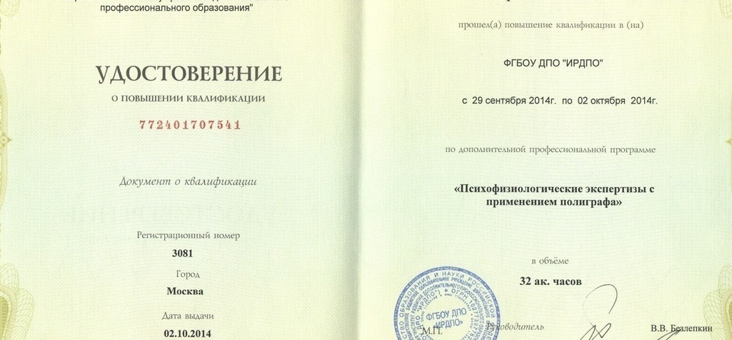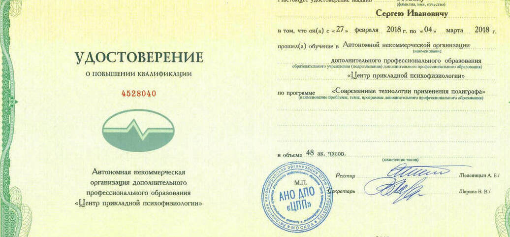 Далее представлены дипломы о высшем образовании, сертификаты об окончании профильных курсов (Институт криминалистики ФСБ России) и свидетельства о ежегодном повышении квалификации. Документы подтверждают право специалиста проводить психофизиологические исследования по актуальным методикам.