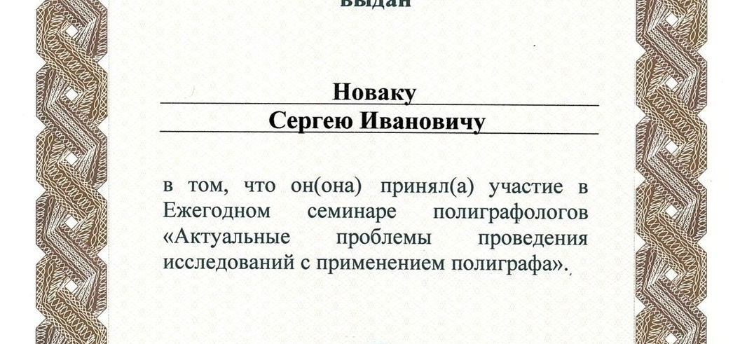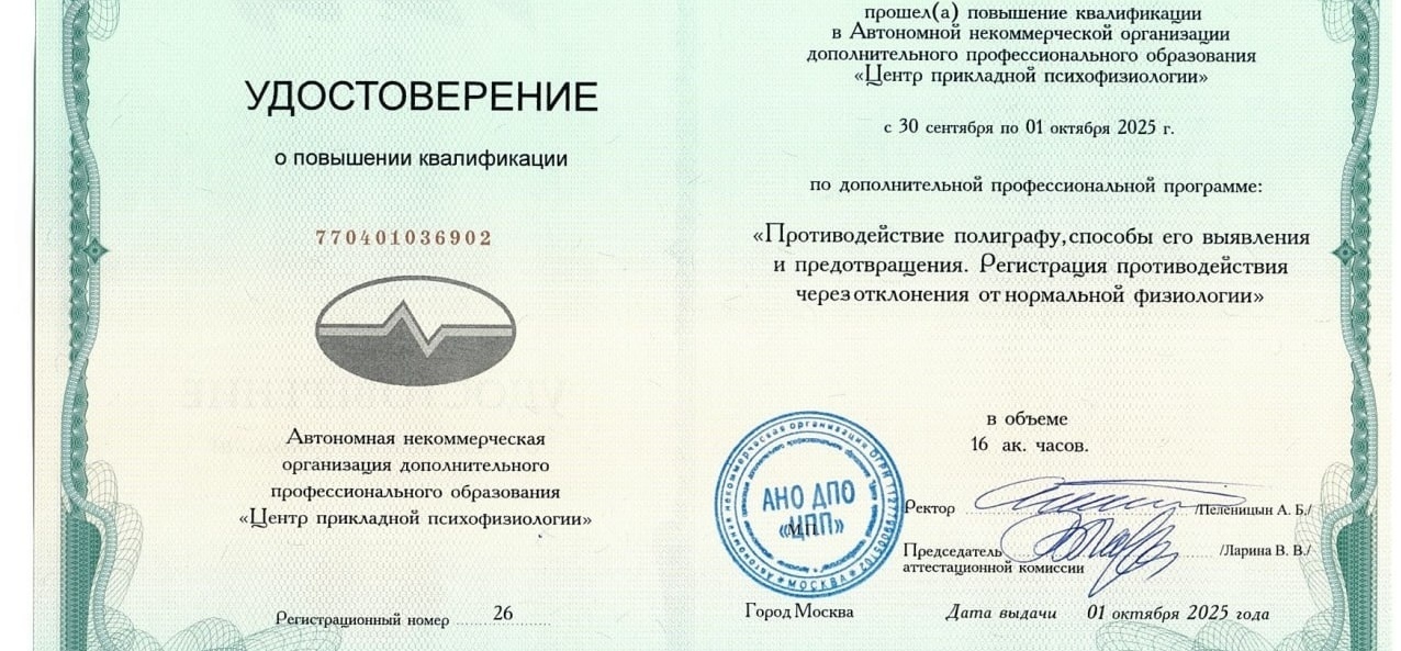 Проведение психофизиологического тестирования — это процесс, требующий не только технического навыка, но и глубокого знания психологии. Все проверки проводятся лично Новаком Сергеем Ивановичем, что исключает риски делегирования задач менее опытным сотрудникам.
