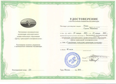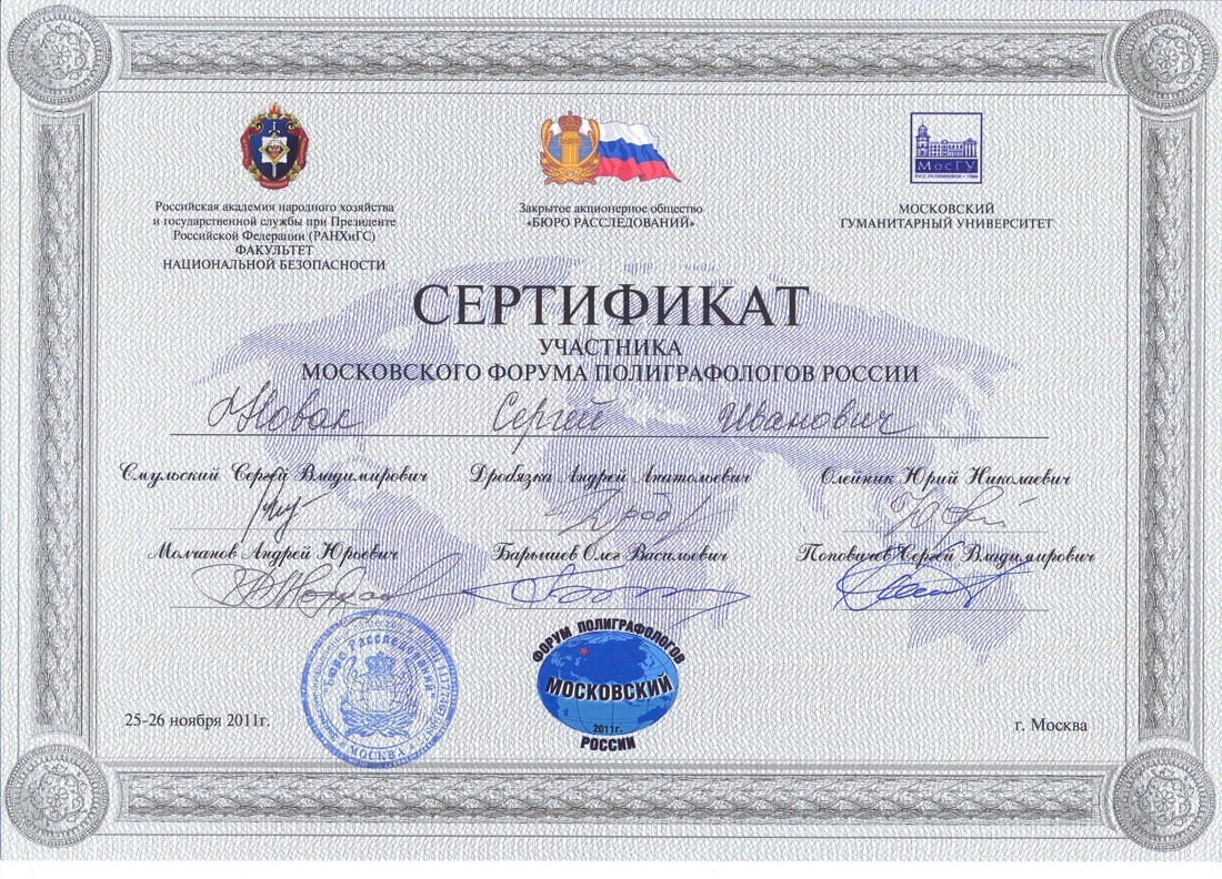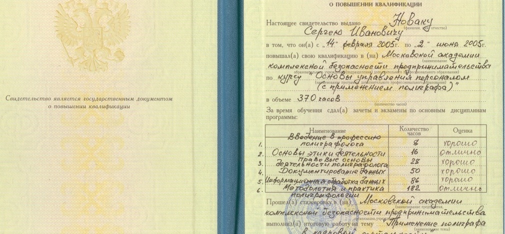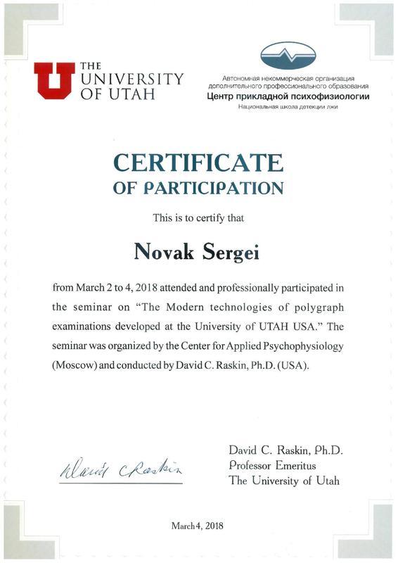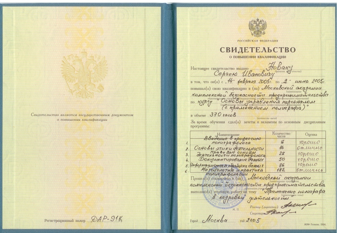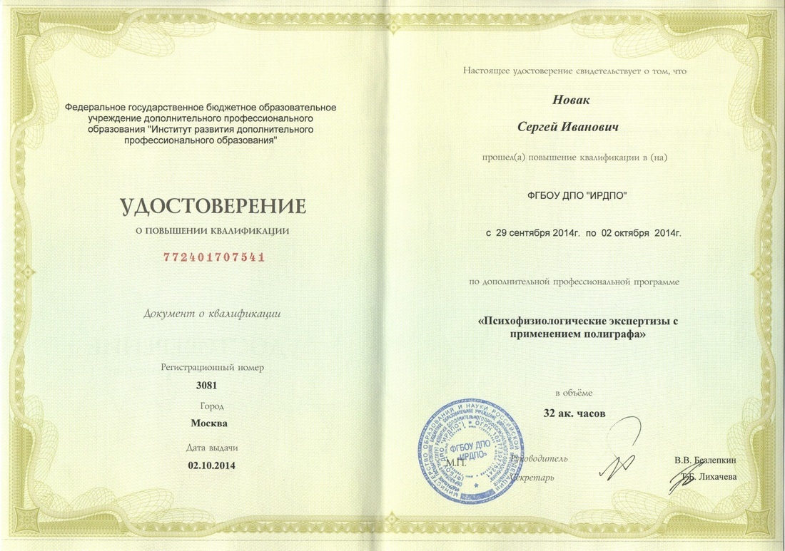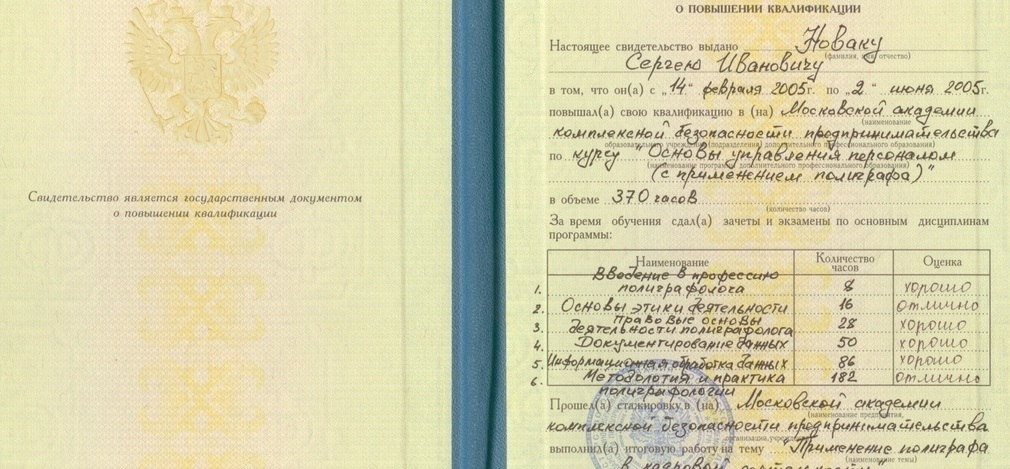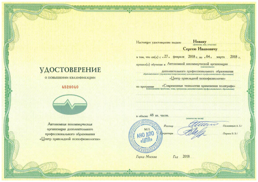 Далее представлены дипломы о высшем образовании, сертификаты об окончании профильных курсов (Институт криминалистики ФСБ России) и свидетельства о ежегодном повышении квалификации. Документы подтверждают право специалиста проводить психофизиологические исследования по актуальным методикам.