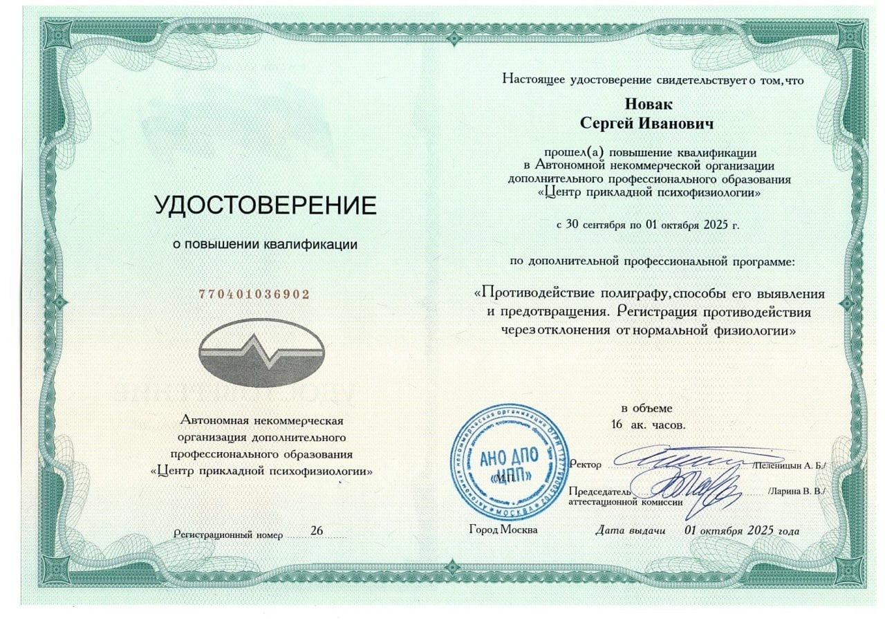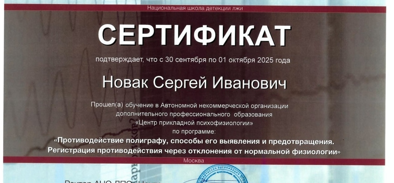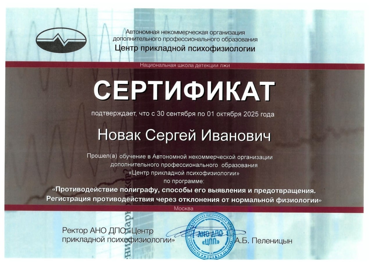 Проведение психофизиологического тестирования — это процесс, требующий не только технического навыка, но и глубокого знания психологии. Все проверки проводятся лично Новаком Сергеем Ивановичем, что исключает риски делегирования задач менее опытным сотрудникам.