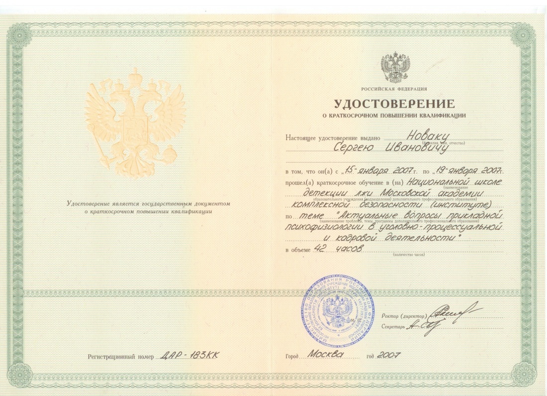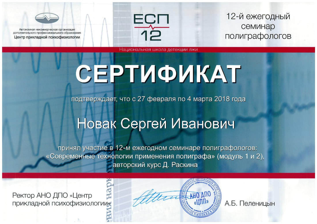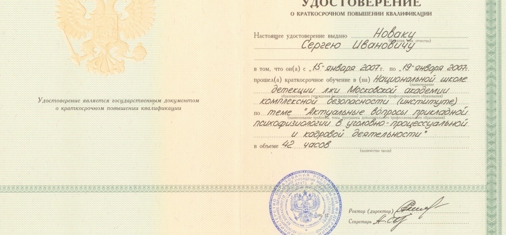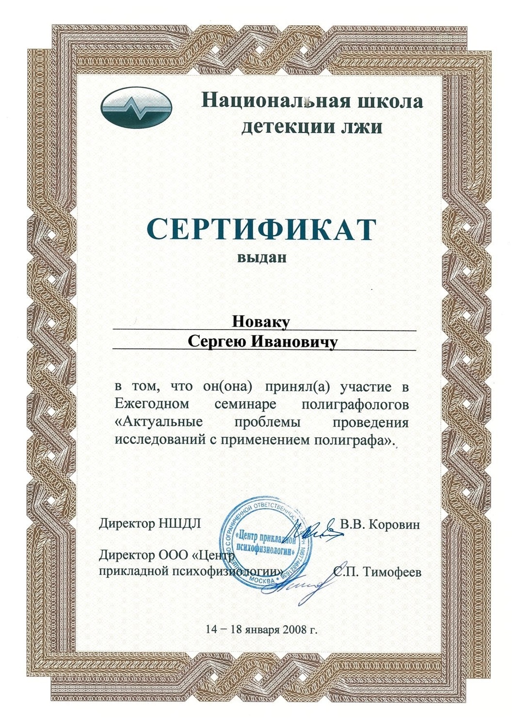 Проведение психофизиологического тестирования — это процесс, требующий не только технического навыка, но и глубокого знания психологии. Все проверки проводятся лично Новаком Сергеем Ивановичем, что исключает риски делегирования задач менее опытным сотрудникам.